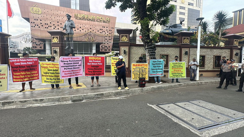 Jakarta | Korban pencurian yang disuruh penyidik Polsek Pancur Batu Brigadir Shinto Zelmana Sembiring menangkap dan mengamankan pelaku pencurian melakukan aksi Demo di Mabes Polri pada Jumat,12 Desember 2025 siang.